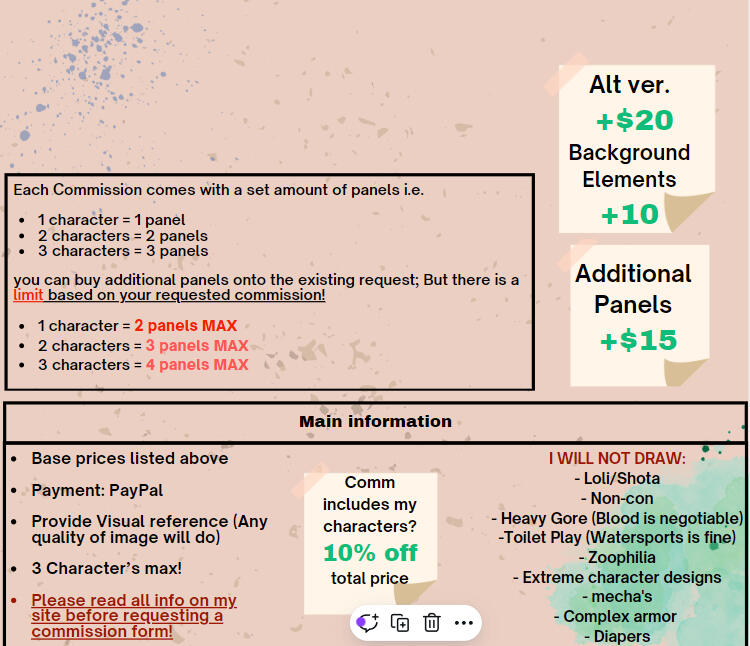 You must be 18 or older to commission meI will promptly accept Google Form submissions, DMs will be delayed in response.I do not design characters from scratch, please provide references and explain exactly what you want. Any quality of reff works! Stick drawings are more than welcome if you can’t find the pose you want!I hold my OC's very dear, so I will be picky about what you make me draw if they’re involved. If you ask me to draw my OCs doing something out of character for them, I will decline it.I’m only accepting one request per person. If you have more than one idea, either pick your favorite or put them on Separate forms for me to choose.